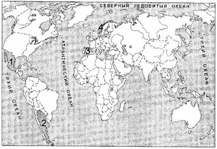 Конфликт из-за Фолклендских (Мальвинских) островов произошёл в 1982 г. между Великобританией и государством, территория которого обозначена на карте цифрой:
