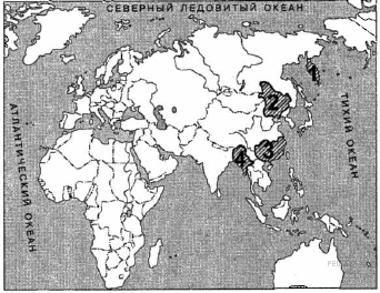 Государство Маньчжоу-Го, подчиненное Японии, было создано в начале 1930-х гг. на территории, обозначенной на карте цифрой: