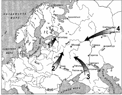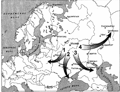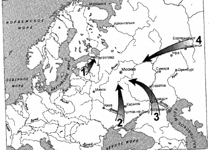 В годы Гражданской войны в России добровольческая армия генерала А. И. Деникина наступала в направлении, указанном на карте цифрой:
